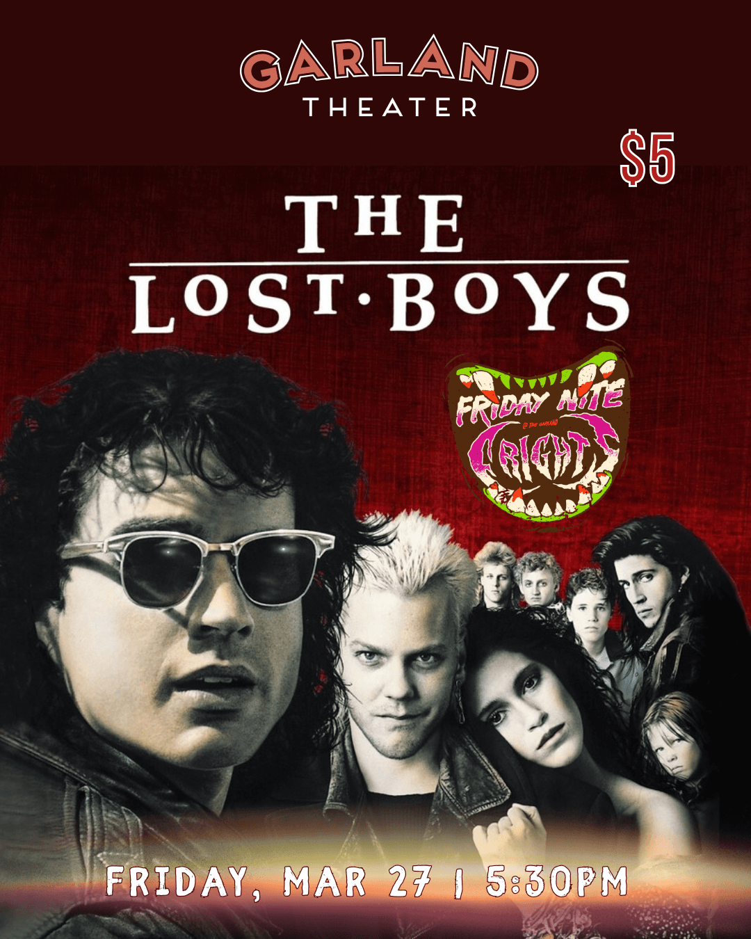 « All EventsThis event has passed.The Lost BoysMarch 27 @ 5:30 pm« Mars Attacks 30th Anniversary Free with Movie ClubThe Lost Boys Friday Nite Frights 21+ ID REQ. » Add to calendar Google Calendar iCalendar Outlook 365 Outlook Live Details Date: March 27 Time: 5:30 pm Event Category: Showtime